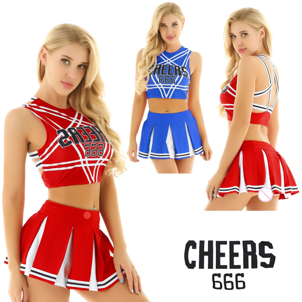 Set Include: 1Pc Crop Top, 1Pc Skirt Condition: New with tag Material: Polyester+Spandex Features: Women ladies cheerleader cosplay costume uniform set, pull on closure. Sleeveless and backless, with elastic straps constructed a pentagram at back, front printed “CHEERS 666” letters. Matching an elastic waistband mini pleated skirt, good stretchy fabric, soft and comfortable to wear.
