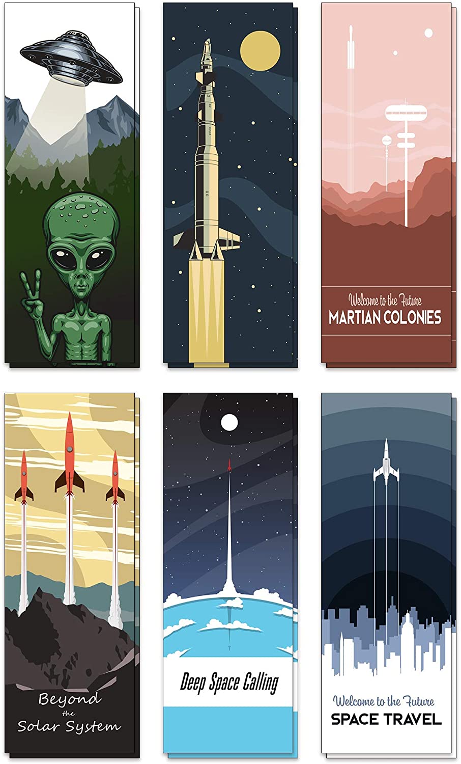 36 bookmarks, 6 of each of the space designs. Printed on recycled 300GSM cardboard and have a very natural and “earthy” feel to them. Printed on both sides with the same design. Great value bookmark set so you need never lose your page again!