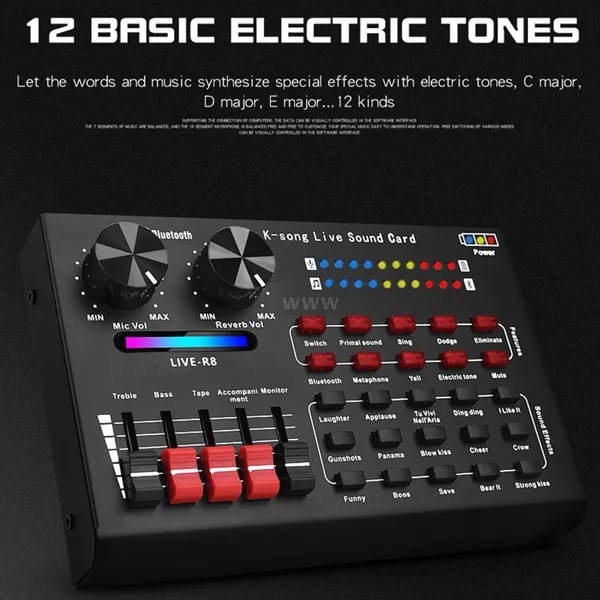 7 Channel live mixing console with built-in effect processor. With 5 MIC, LINE and INSERT input jacks and 2 (L/ R) stereo line input jacks. Can connect XLR/ TRS type microphone, stereo, EQ and other audio devices. With USB input interface and LCD display showing the status of MP3 & USB. With TAPE, MAIN, AUX and PHONE output jacks for effector, recorder, stereo headphone and other audio devices. With RETURN and FX SEND jacks for receiving the signal from external effects unit. Each channel has individual GAIN/ BAL/ 3-band equalizer(HIGH & MID & LOW)/ AUX/ FX knobs, channel fader and PEAK indicator. With 48V phantom power and LED signal lights. Main out panel is equipped with ECHO/ DELAY/ PHONE/ AUX/ FX knobs and channel fader. Can be used to make a perfect sound effect for DJ stage, karaoke, party, etc.