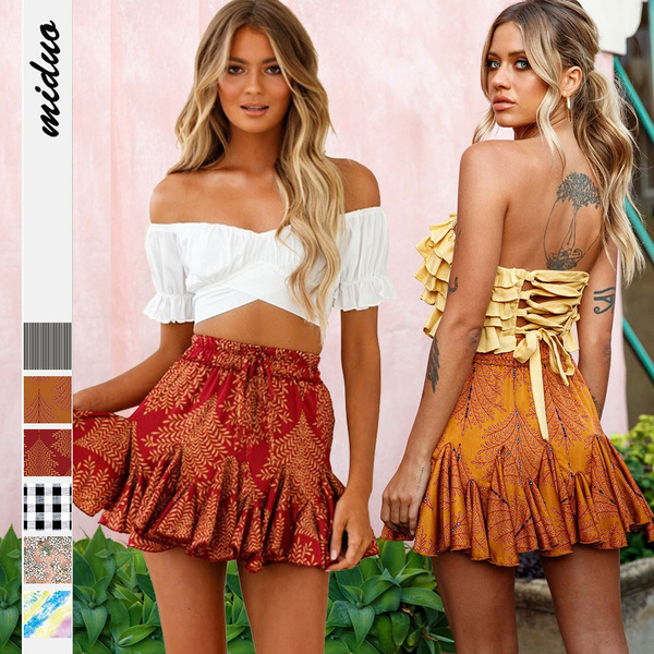 for Women Flower Half-length Skirt Printed Beach Short Mini Skirts Color: Blue, Leopard, Blue dot, Navy, Green, Yellow, Red dot, Orange, Light yellow Size: S-M-L-XL-2XL MaterialL Chiffon Season: Summer